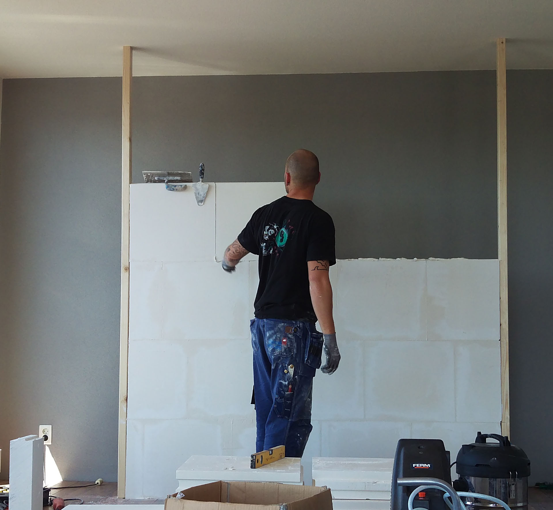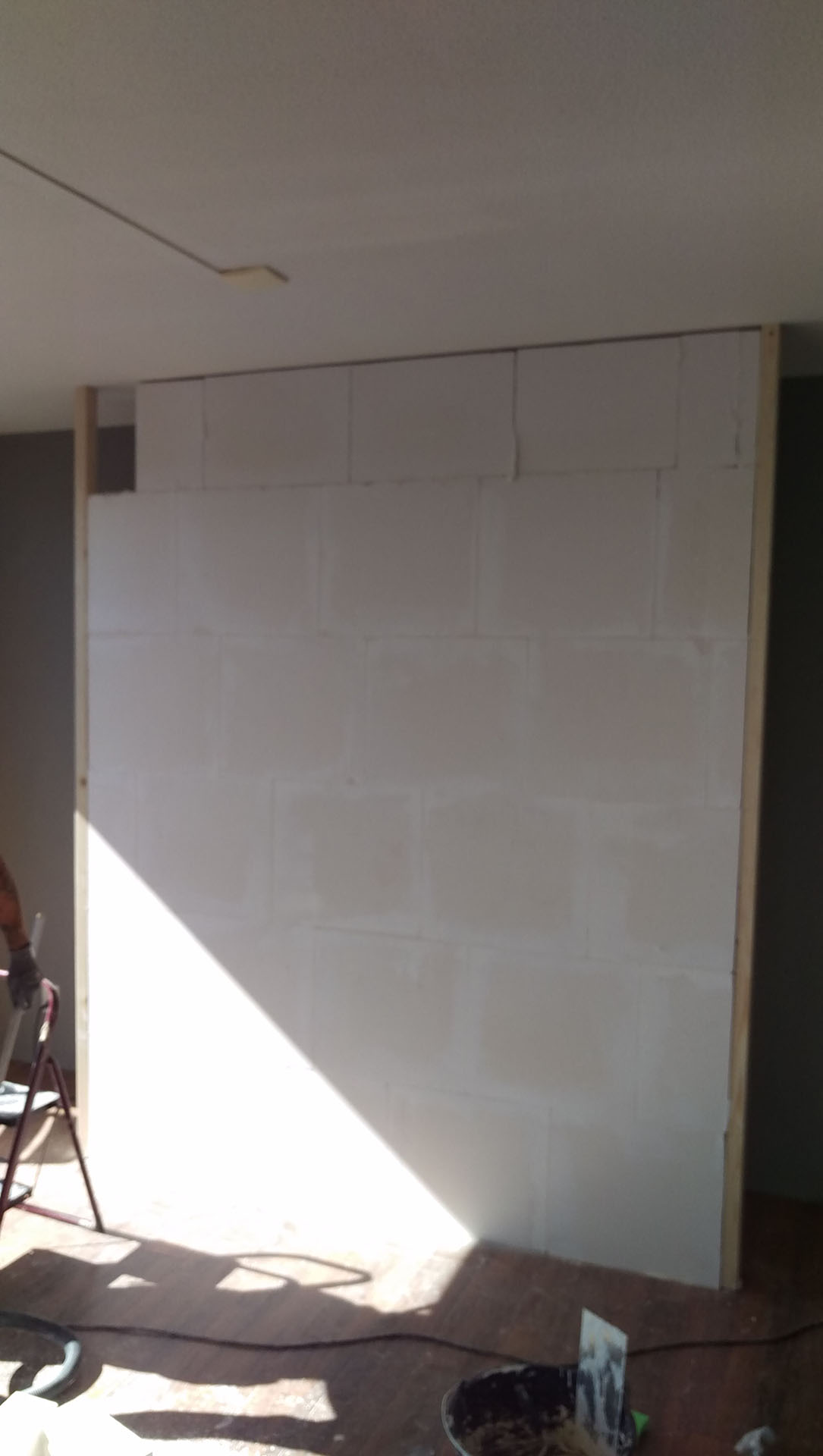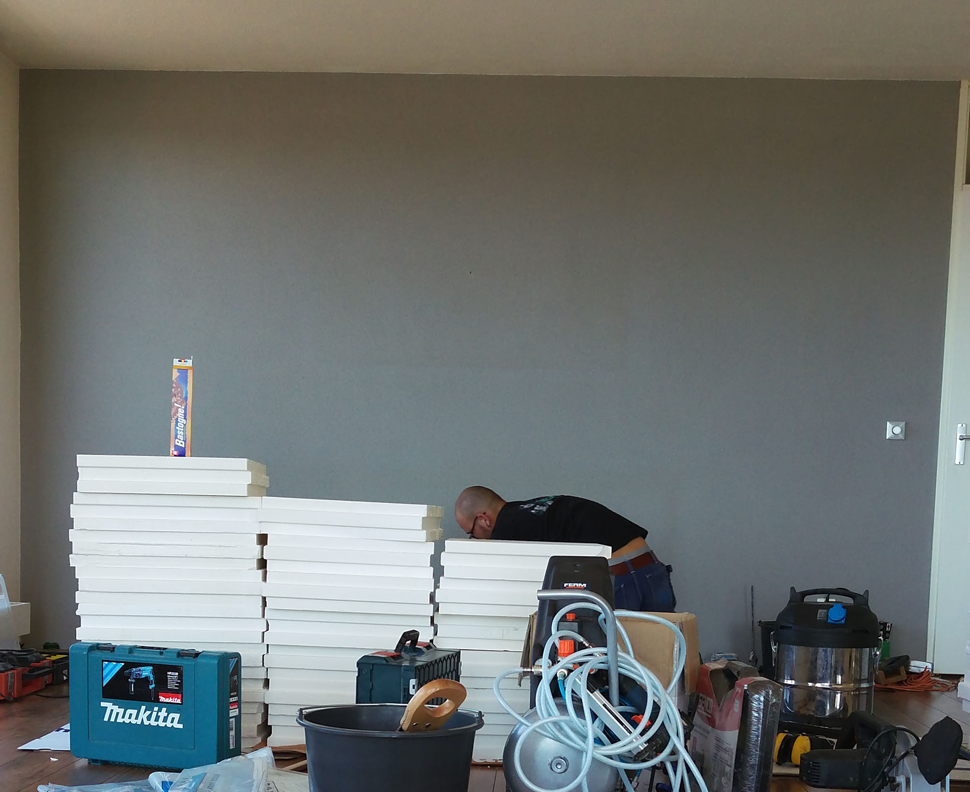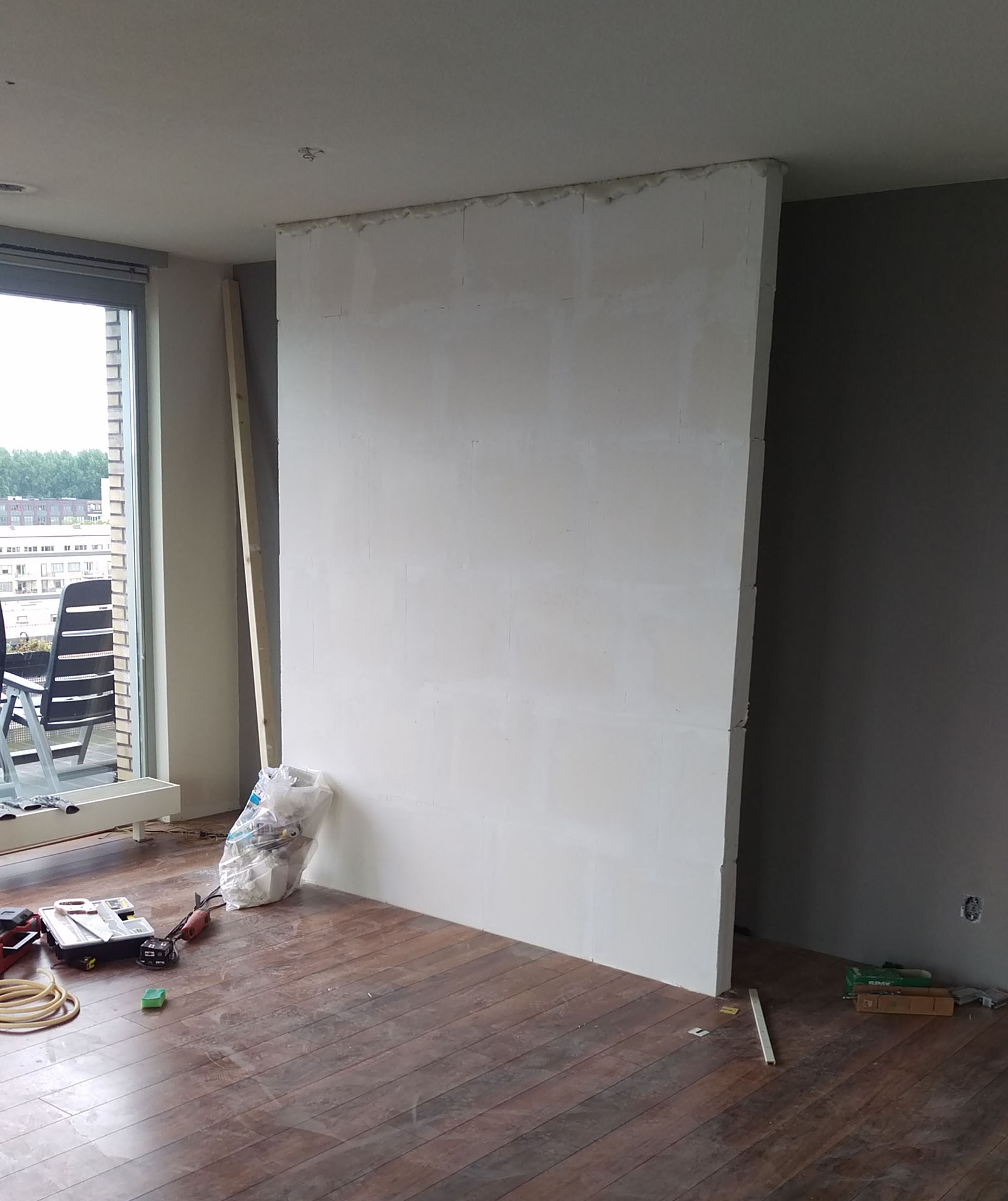 Onmogelijk om een opgeruimde woonkamer te combineren met al deze apparatuur. Om dit probleem op te lossen, heb ik een extra muur laten plaatsen voor de muur waar ik oorspronkelijk de televisie wilde plaatsen. Door middel van gipsplaten is deze muur opgebouwd, waarna de stucadoor en de schilder hem onder handen hebben genomen.