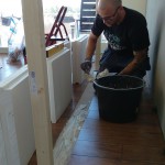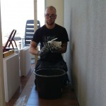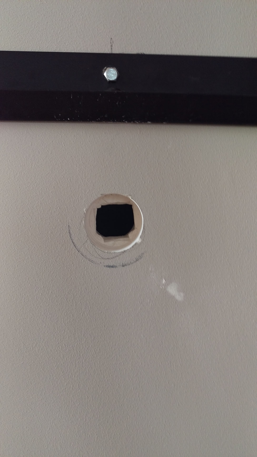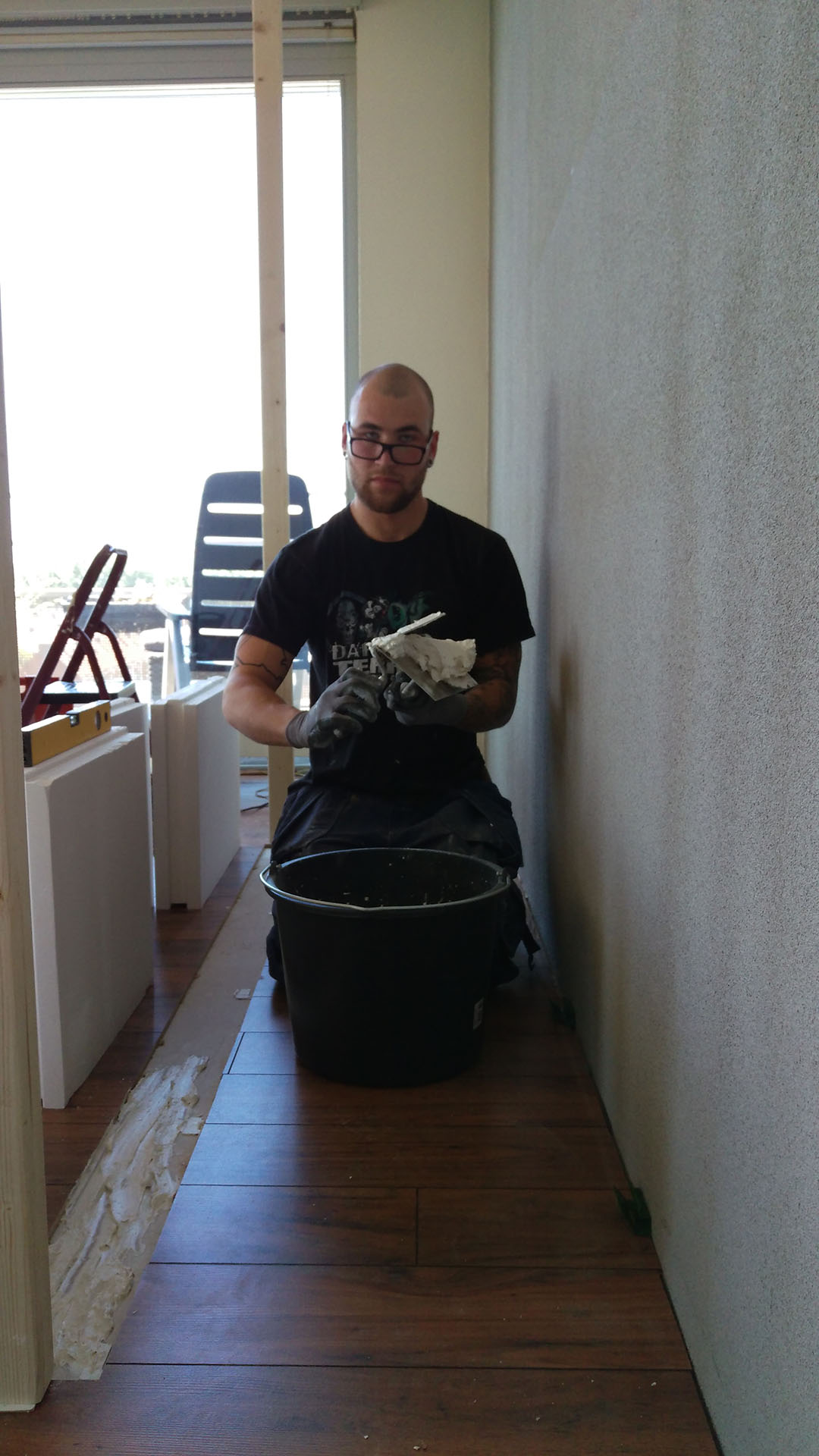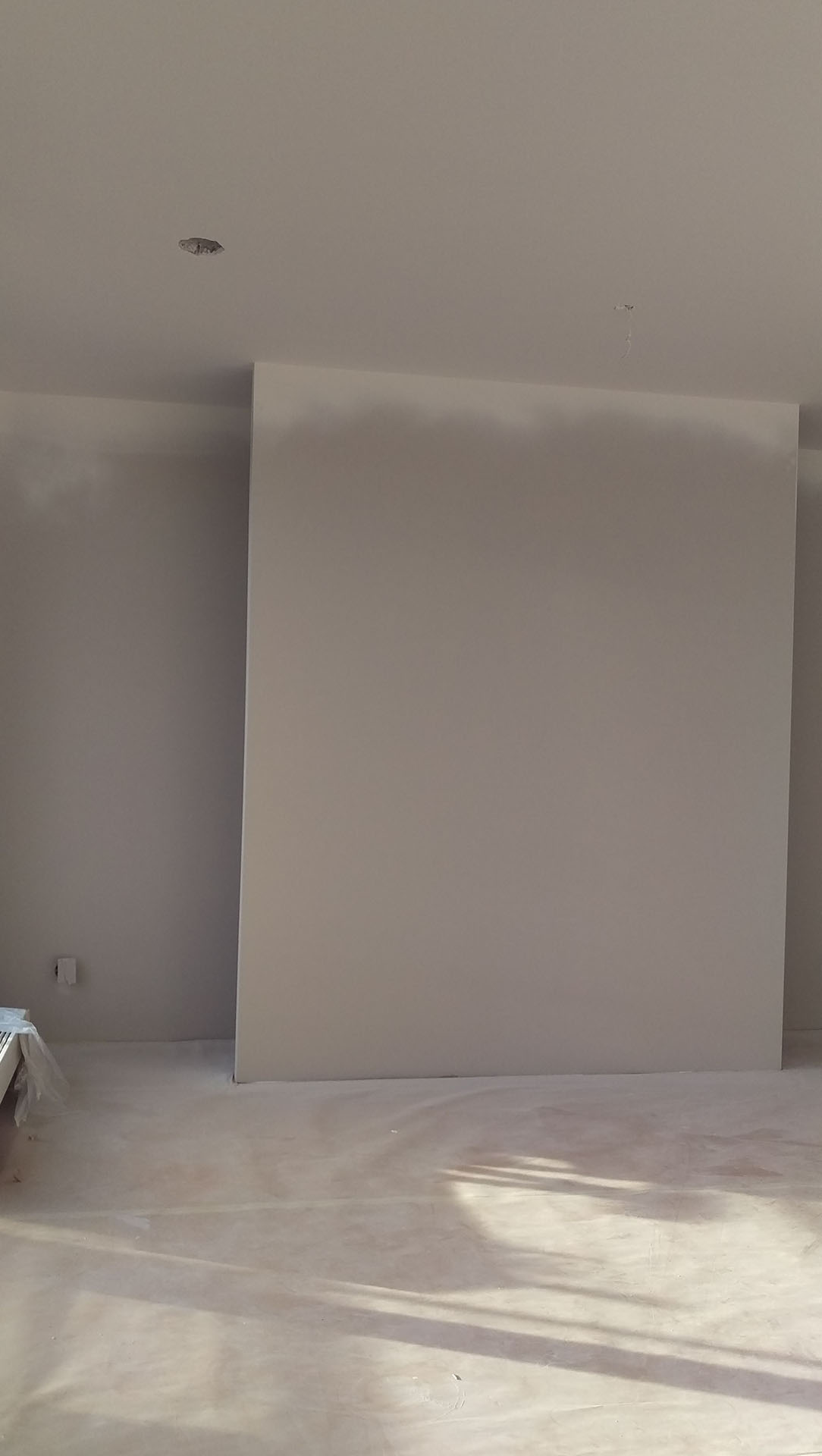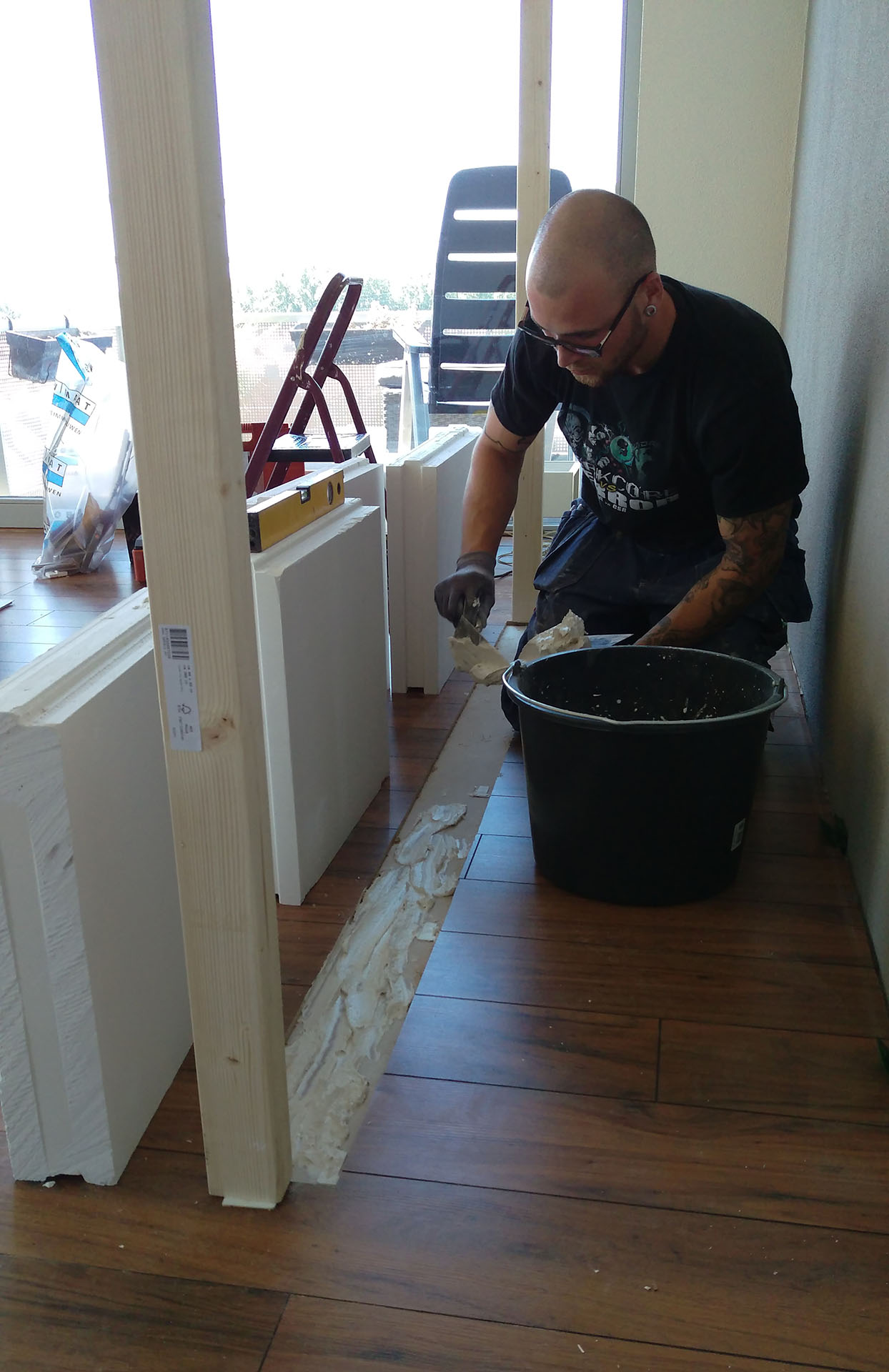 Onmogelijk om een opgeruimde woonkamer te combineren met al deze apparatuur. Om dit probleem op te lossen, heb ik een extra muur laten plaatsen voor de muur waar ik oorspronkelijk de televisie wilde plaatsen. Door middel van gipsplaten is deze muur opgebouwd, waarna de stucadoor en de schilder hem onder handen hebben genomen.