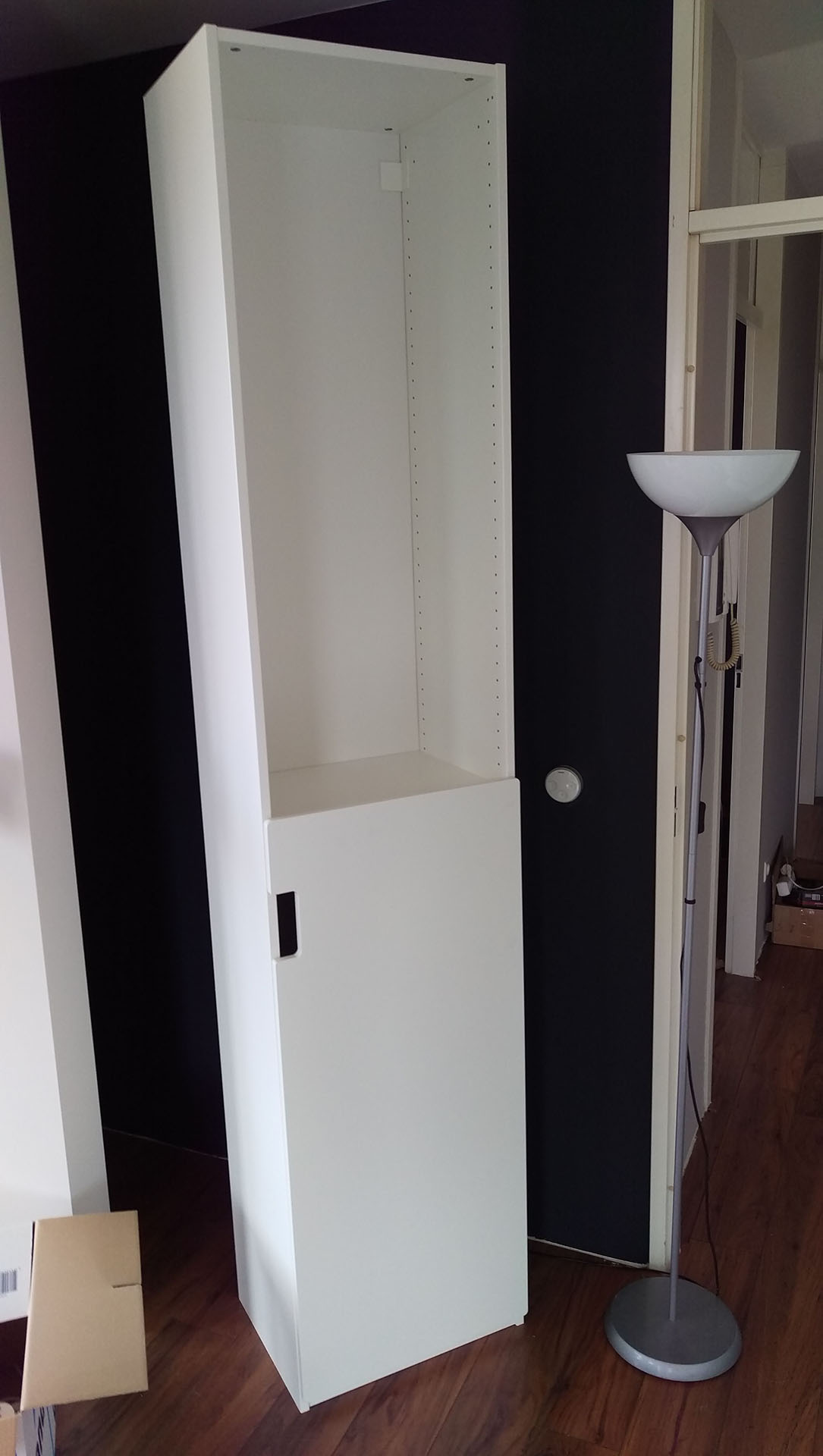 De ruimte tussen de nieuwe muur en de oude muur heb ik op circa 56 centimeter gehouden. Hierdoor past er precies een simpele Ikea-kast tussen, waardoor je voor een paar tientjes klaar bent met je op maat gemaakte ’tv-meubel’. Het eindresultaat is prachtig! Alle apparatuur uit zicht. Even een gat boren in de muur om de kabels naar achteren te brengen, en eventueel de boxen er ook aan hangen.